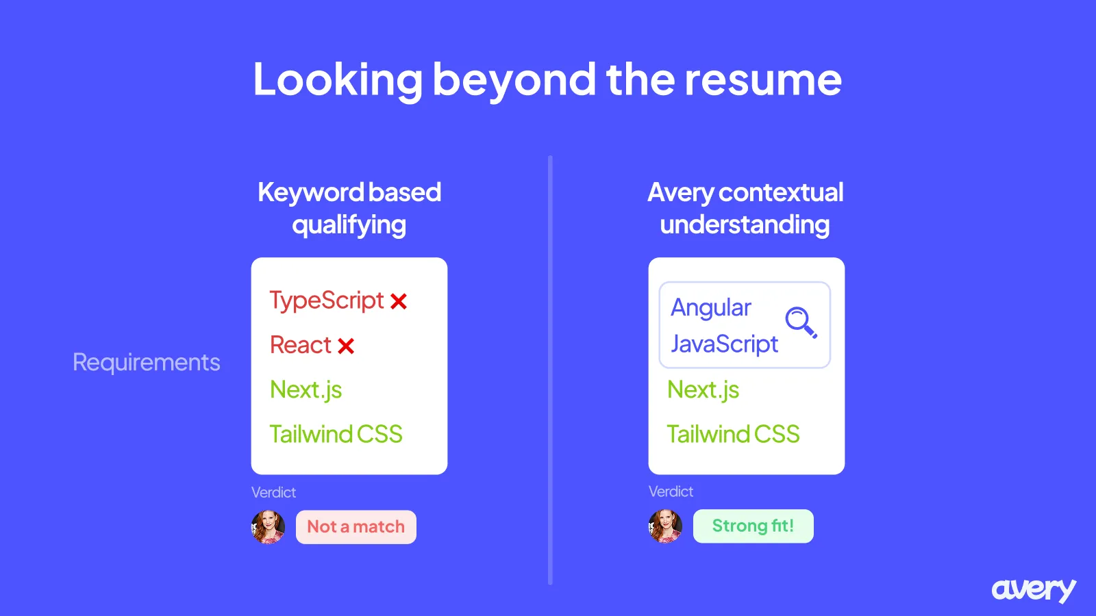 - Matching beyond keywords: Avery identifies real skills, not just written keywords, and catches candidates traditional search misses.